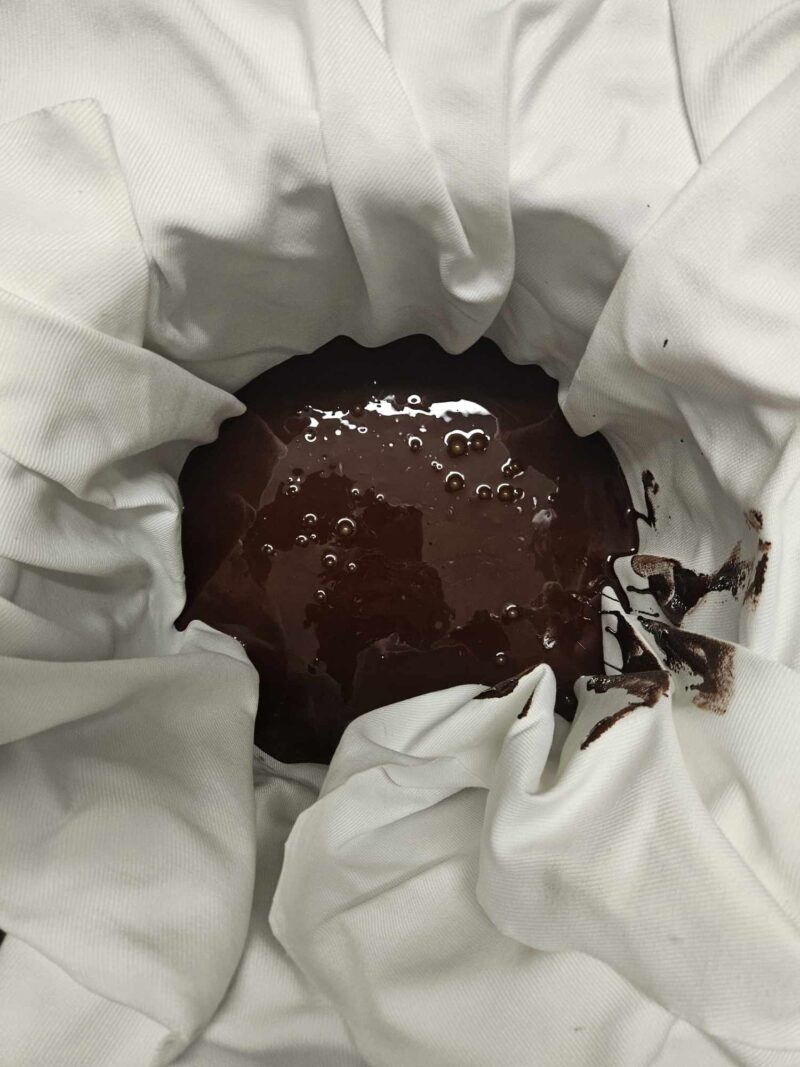 The cocoa cake remains in the filter bag, we grind it very finely and obtain natural cocoa powder, aromatic, non-alkalised.